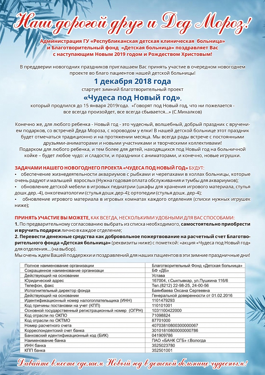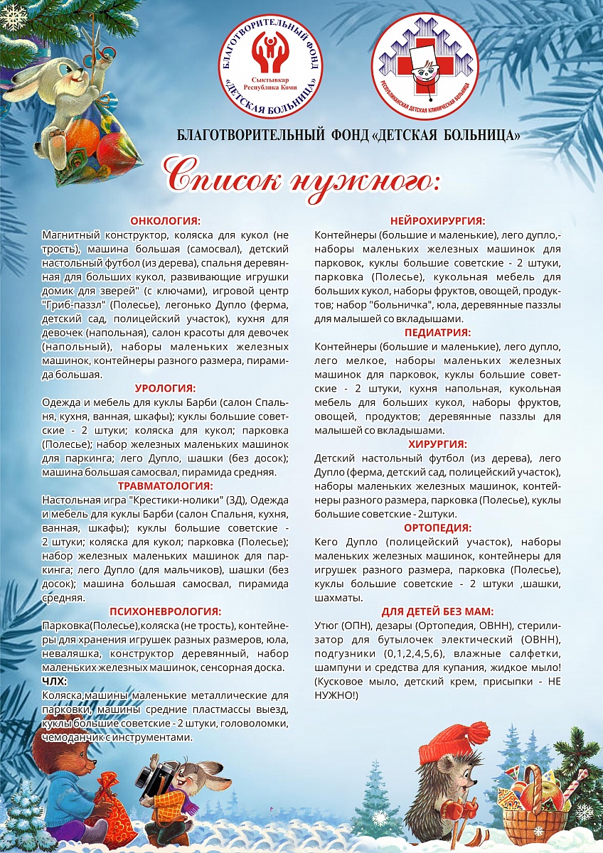 В нашем разделе "Благотворительность/Наши акции" опубликована подробная информация об очередном зимнем новогоднем благотворительном проекте в помощь детям, которые под Новый год оказались на больничной койке. |