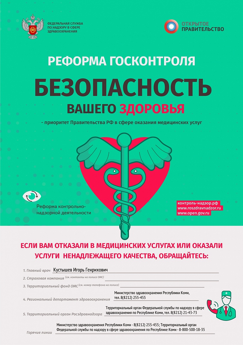 | Федеральной службой по надзору в сфере здравоохранения разработан баннер «Реформа госконтроля безопасность вашего здоровья – приоритет Правительства РФ в сфере оказания медицинских услуг», для информирования граждан о номерах контактных телефонов, необходимых в случаях обращений по вопросам отказа в медицинских услугах или оказания медицинских услуг ненадлежащего качества. |