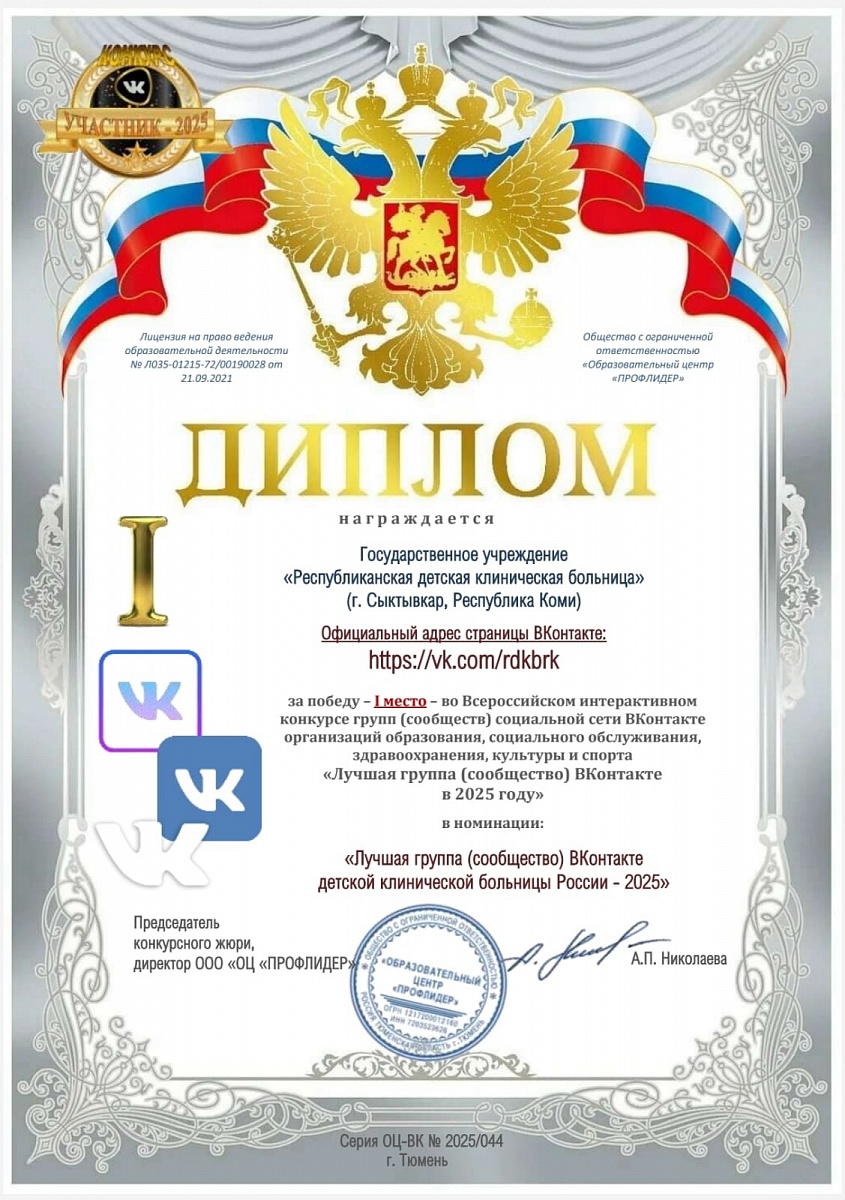 Победителем в номинации «Лучшая группа (сообщество) ВКонтакте детской клинической больницы России – 2025» стал паблик Республиканской детской клинической больницы Коми.