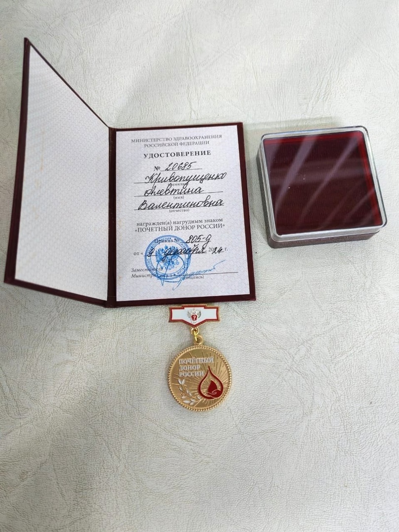 Поздравляем старшую медсестру приёмного отделения Кривопущенко А.В. с наградой - Почетный донор России!