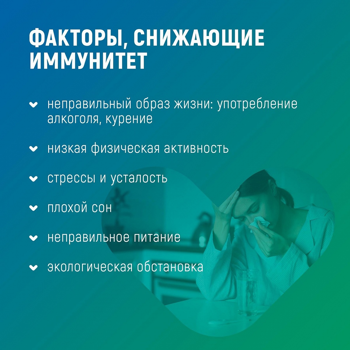 К факторам, которые снижают иммунитет, относятся употребления алкоголя и курение, низкая физическая активность, стрессы и усталость, плохой сон, неправильное питание, экологическая обстановка. |