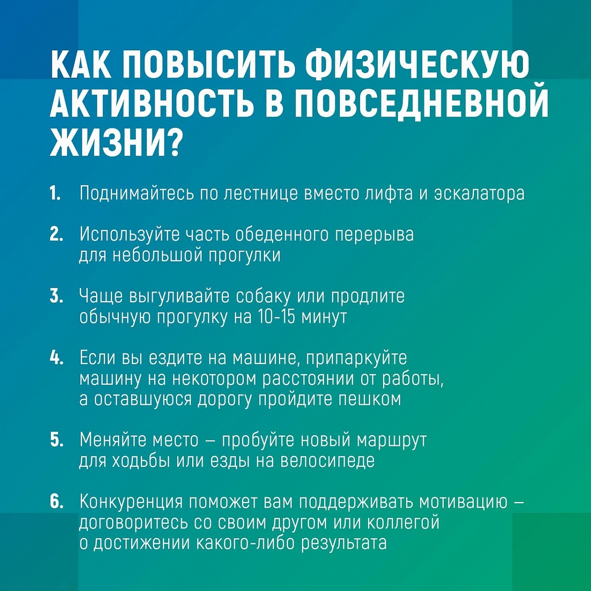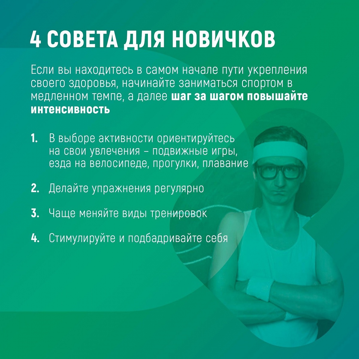 Всем с раннего детства известна эта фраза, но что означает «здоровое тело»? Как определить интенсивность физической нагрузки для себя? И какие простые шаги к здоровью может сделать каждый? Все подробности — в карточках. |
